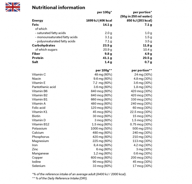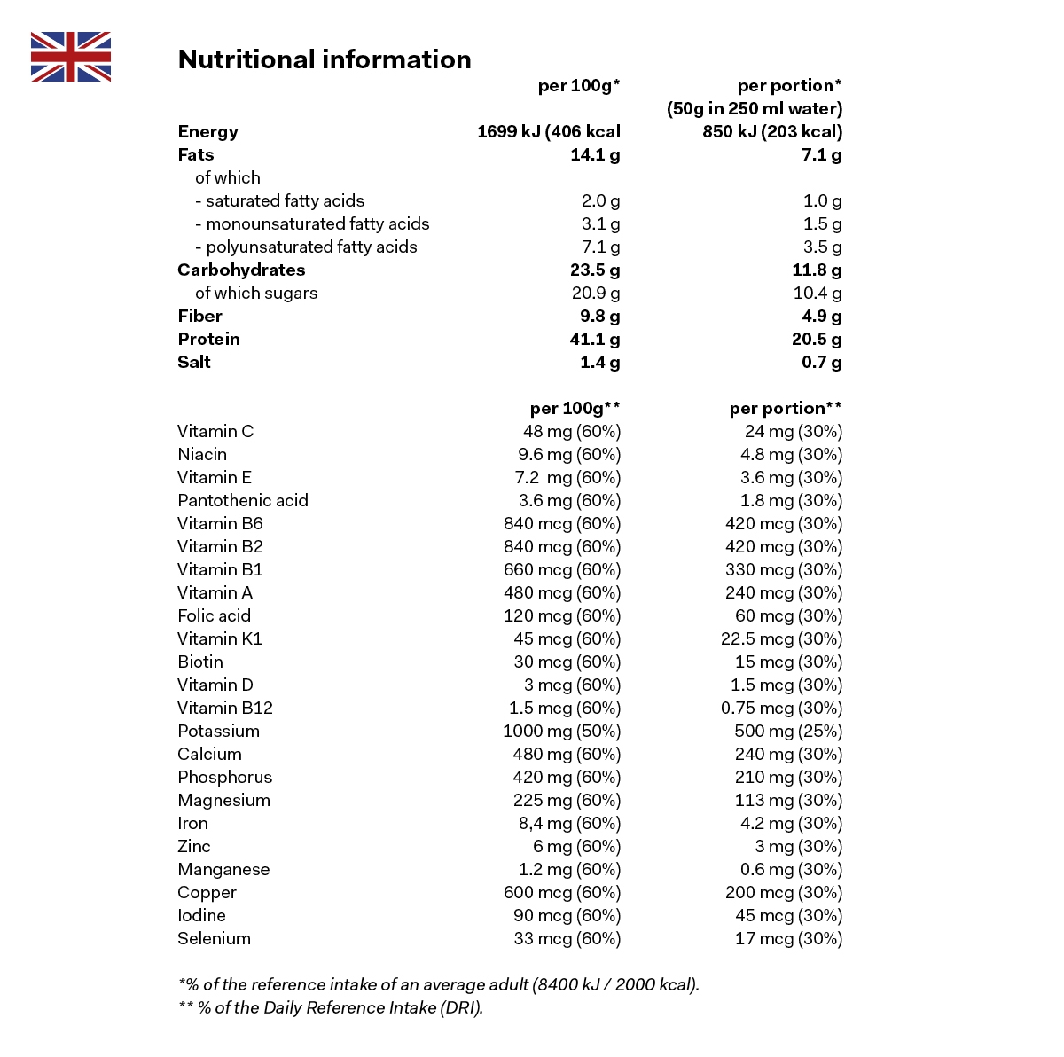 Whey protein concentrate (milk), isomaltulose, soybean oil, hydrolysed fishcollagen, skimmed milkpowder, minerals (potassium, calcium, phosphorus, sodium, magnesium, iron, zinc, manganese, copper, iodine, selenium), inulin, acacia fibre, glucose syrup, xanthan gum, fructo oligosaccharide, flavour, soylecithin, silica, vitamins (vitamin C, niacin, vitamin E, pantothenic acid, vitamin B6, riboflavin, thiamine, vitamin A, folic acid, vitamin K1, biotin, vitamin D, vitamin B12), sweeteners, (sucralose, steviol glycosides), antioxidants (tocopherol, rosemary extract)