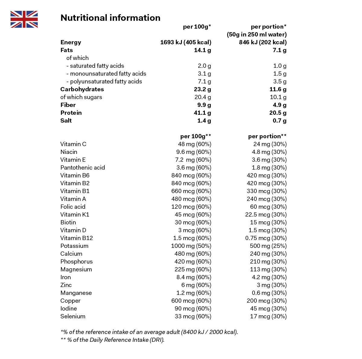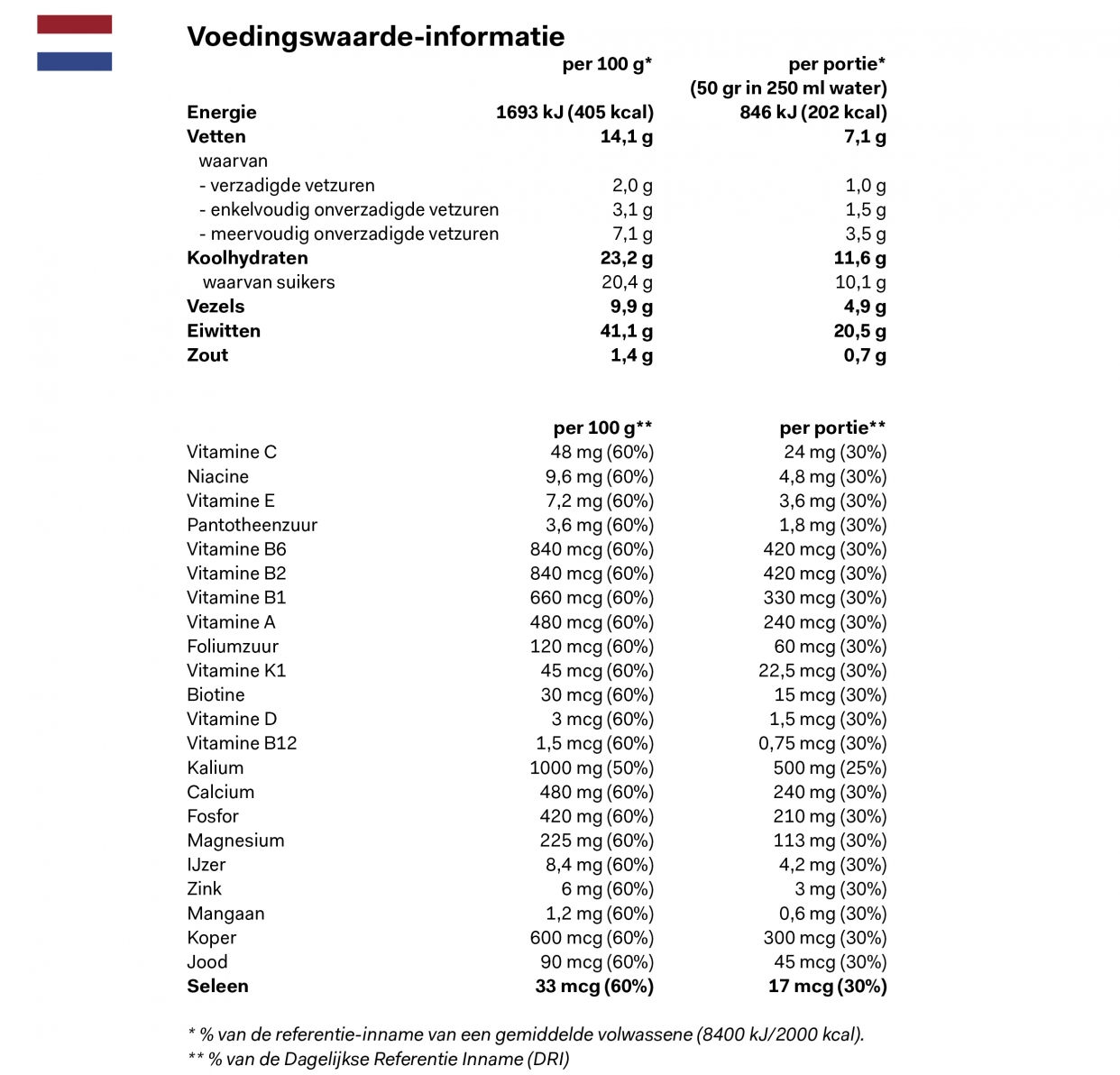 Wei-eiwitconcentraat (melk), isomaltulose, gehydrolyseerd viscollageen, mageremelkpoeder (melk), mineralen (kalium, calcium, fosfor, natrium, magnesium, ijzer, zink, mangaan, koper, jood, seleen), inuline, acaciavezel, xanthaangom, fructo-oligosacharide, aroma, sojalecithine, siliciumdioxide, vitaminen (vitamine C, niacine, vitamine E, pantotheenzuur, vitamine B6, riboflavine, thiamine, vitamine A, foliumzuur, vitamine K1, biotine, vitamine D, vitamine B12), zoetstoffen (sucralose, steviolglycosiden), antioxidanten (tocoferol, rozemarijnextract).