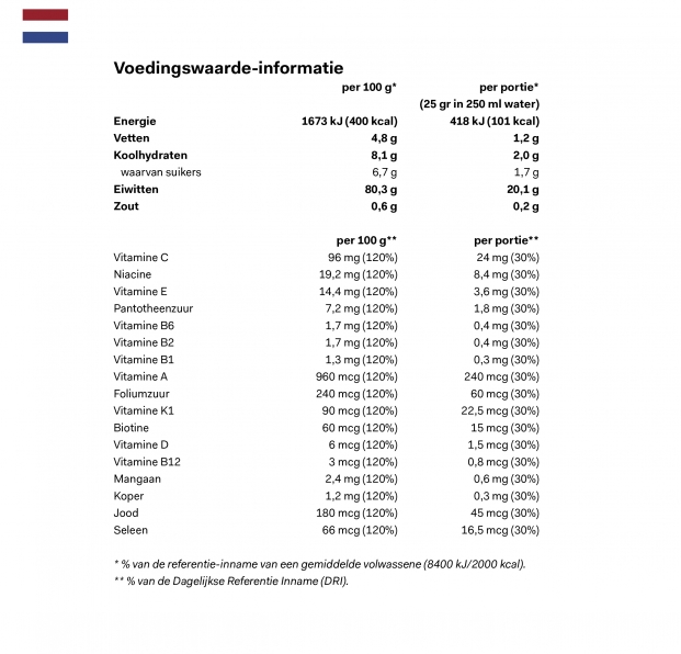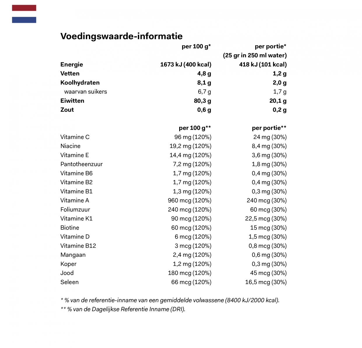 88% wei-eiwitconcentraat (melk), 10% gehydrolyseerd collageen (vis), cacao, aroma, sojalecithine, vitaminen (vitamine C, niacine, vitamine E, pantotheenzuur, vitamine B6, riboflavine, thiamine, vitamine A, foliumzuur, vitamine K1, biotine, vitamine D, vitamine B12), mineralen (mangaan, koper, jood, seleen), siliciumdioxide, zoetstof (sucralose).