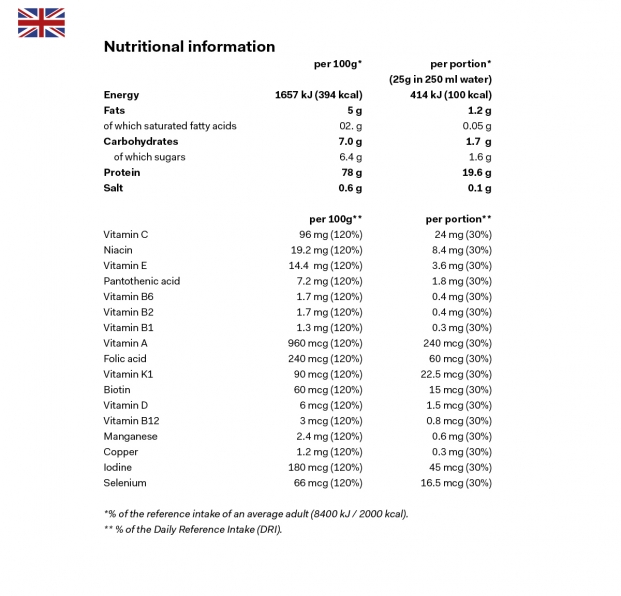 88% whey protein concentrate (milk), 10% hydrolysed collagen (fish), flavour, soy lecithin, vitamins (vitamin C, niacin, vitamin E, pantothenic acid, vitamin B6, riboflavin, thiamin, vitamin A, folic acid, vitamin K1, biotin, vitamin D, vitamin B12), minerals (manganese, copper, iodine, selenium), silicon dioxide, colouring agent (beta-carotene), sweetener (sucralose).